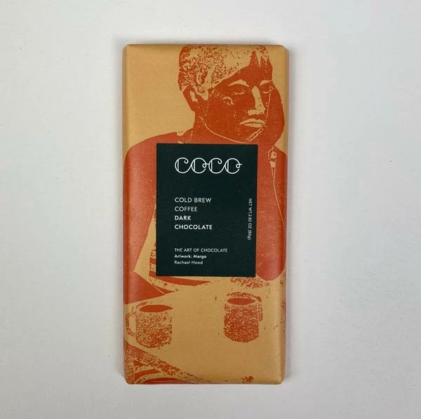 Cold brew coffee dark chocolate. Gluten Free, Vegan. Coco is a UK based company, they source the chocolate from origin and make all their bars in Edinburgh, Scotland. All the artwork is designed by independent artists from around Europe.