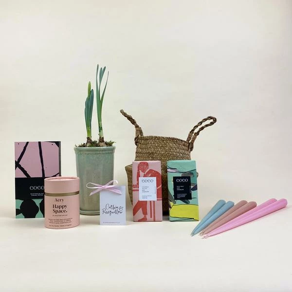 Our Happy Space Valentine’s Gift Hamper features some of our favourite Catkin gifts. With the option to add gorgeous tapered Ester & Erik dinner candles or a Catkin & Pussywillow Flower. The gifts are arranged in a seagrass belly basket, which can be used for a plant or storage afterwards. Gift baskets are available for Click & Collect from store or Same Day Local and Next Day Nationwide Delivery This gift basket includes: Salted Caramel Truffles Happy Space Candle Potted Narcissi in Green Ceramic Pot 2 Coco Chocolate bars Seagrass Belly Basket.