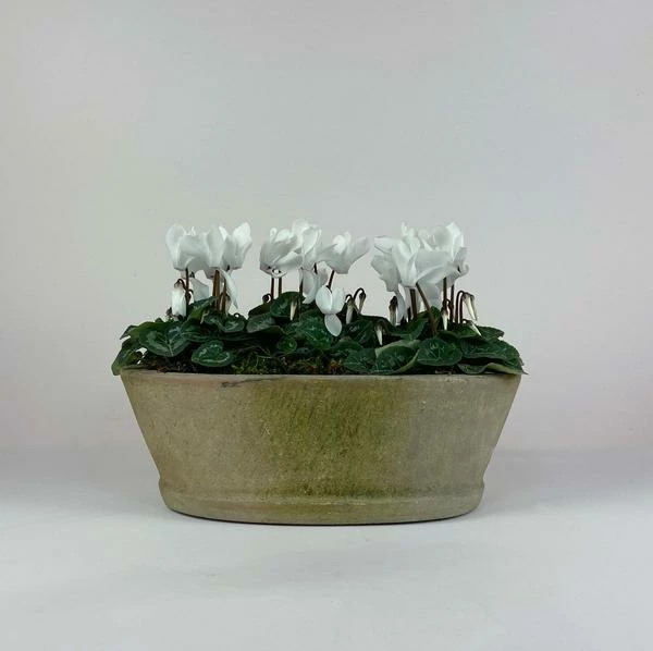 Cyclamen are easy to care for and add a welcome burst of colour during the winter months. Three plants are presented in a rustic terracotta oval planter, it makes a perfect gift or a lovely addition to the home. Choose from 4 different colours, the image shows white cyclamen. Plant Pot: 40cm x 20cm x 14cm