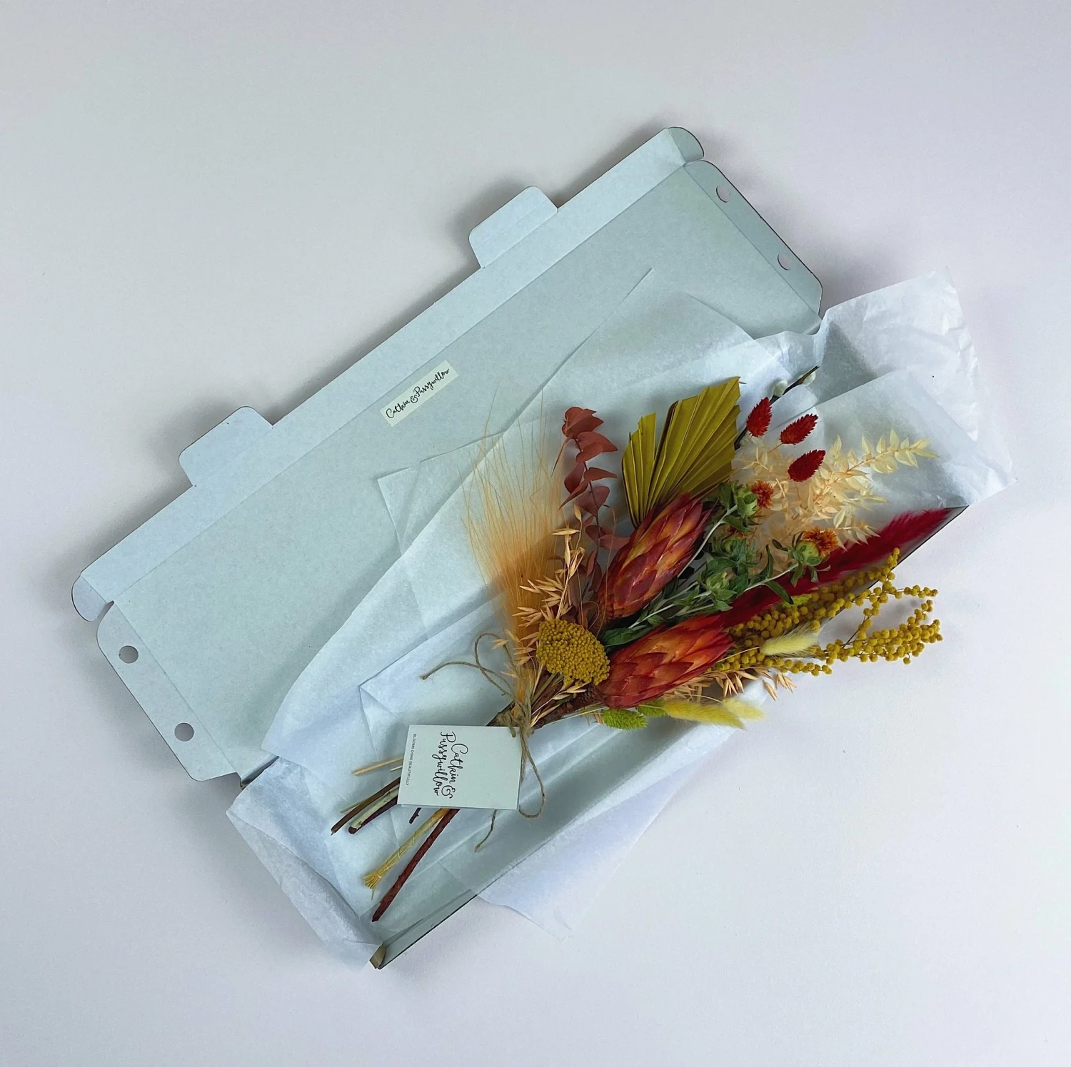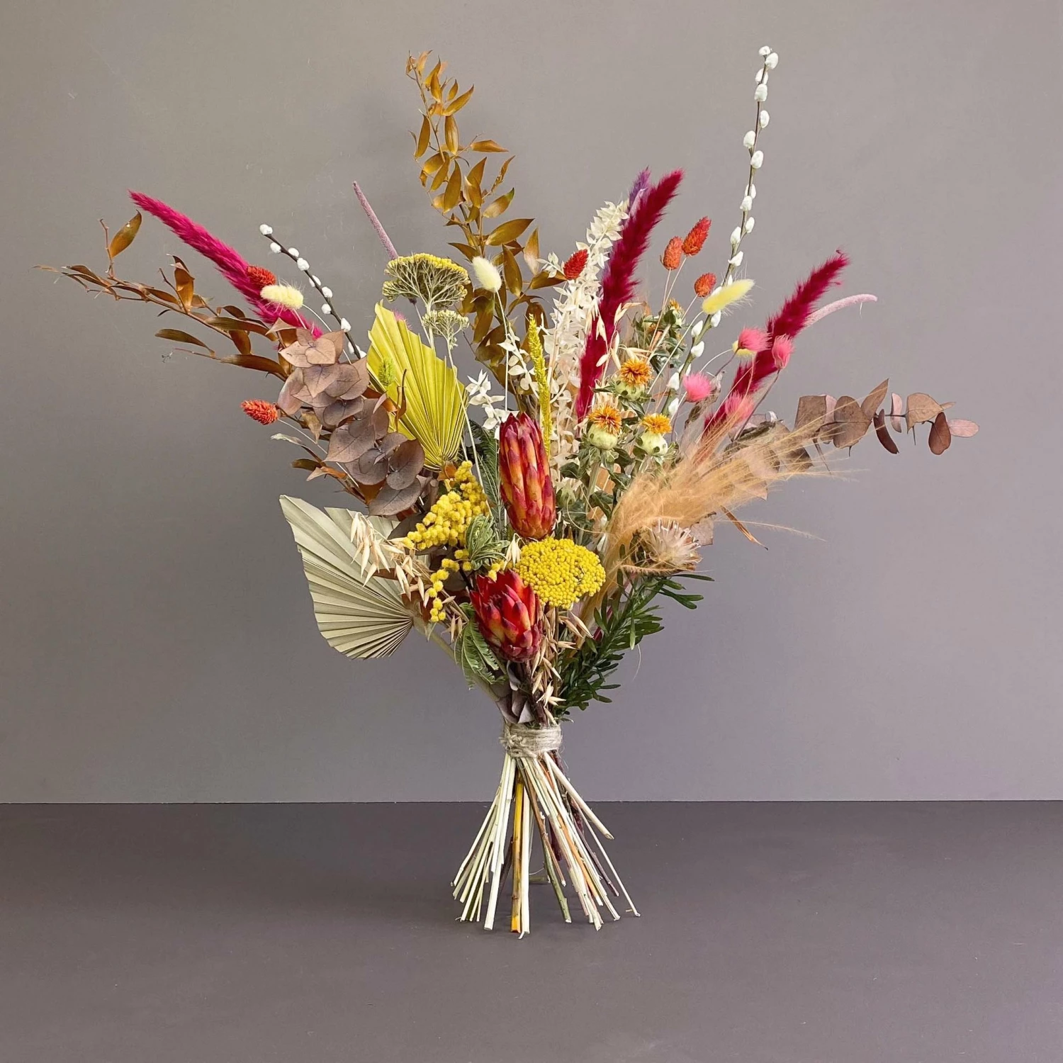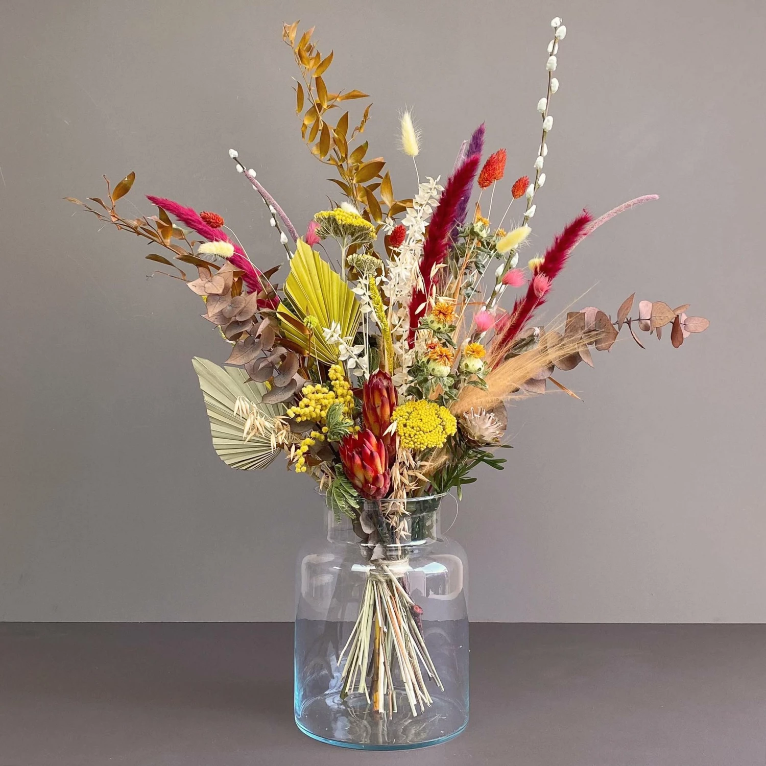 An everlasting arrangement of our favourite autumnal stems. Available in a range of sizes and the option to buy with or without a vase. We also have letter box stems, posted straight to your door to have a go arranging yourself at home. A perfect gift or addition to the home, these are an eco friendly caktin and pussywillow favourite. All of our bouquets are hand made to order meaning each one is truly unique. The pictures show an example of the bouquet, and you can expect to receive one featuring seasonal flowers similar in colour, style and texture.