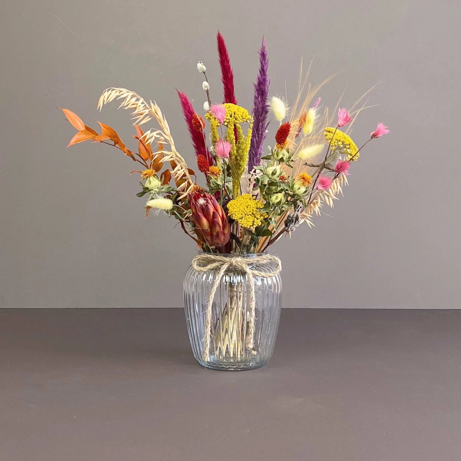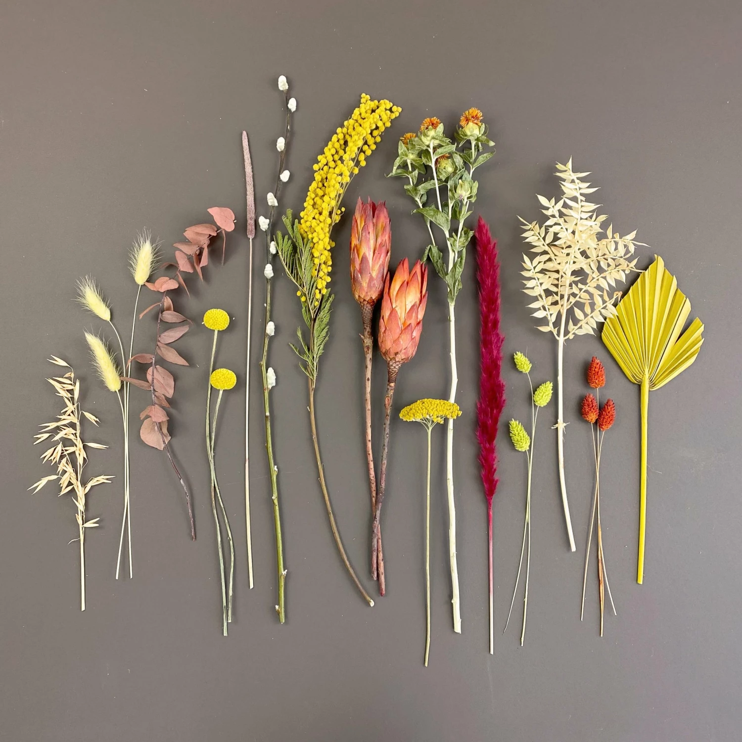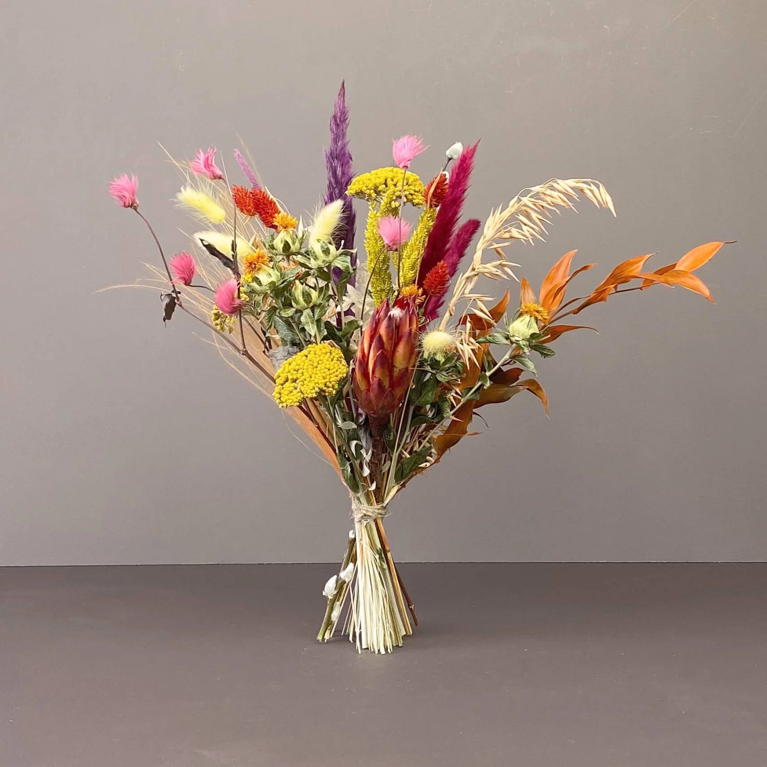 An everlasting arrangement of our favourite autumnal stems. Available in a range of sizes and the option to buy with or without a vase. We also have letter box stems, posted straight to your door to have a go arranging yourself at home. A perfect gift or addition to the home, these are an eco friendly caktin and pussywillow favourite. All of our bouquets are hand made to order meaning each one is truly unique. The pictures show an example of the bouquet, and you can expect to receive one featuring seasonal flowers similar in colour, style and texture.