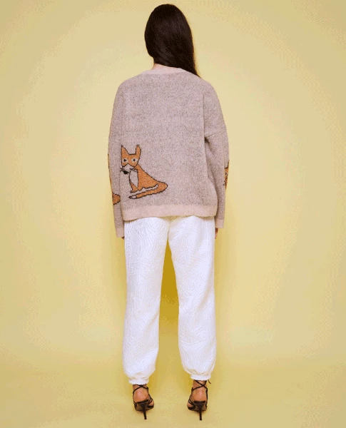 Stella Nova Adelin Fox Knit, a brown knitted pullover with long sleeves and a round neck. Designed with dropped shoulders and a loose fit this fluffy mohair jumper is decorated with small orange foxes on the chest, back and sleeves. 40% Nylon, 32% Mohair & 28% Wool Hand wash cold and dry flat to avoid stretching Model is 173cm and wears size 38