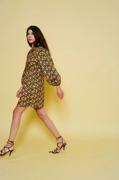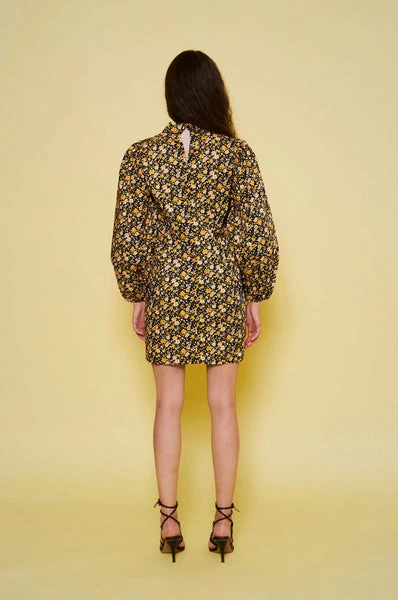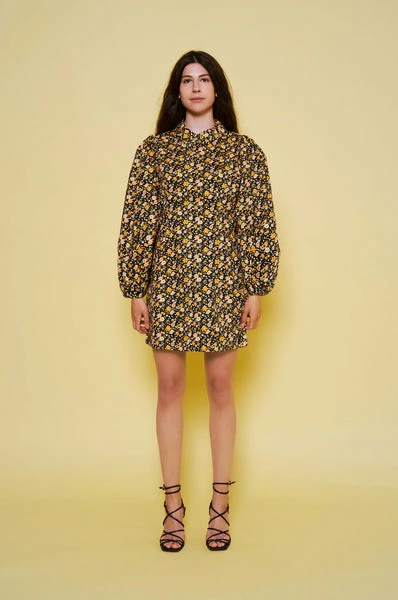 A stunning mini dress from Stella Nova adorned with a sea of beautiful sunny florals offset against a black base. – Standard shirt collat – Front button closure – Long balloon sleeves- True to size.