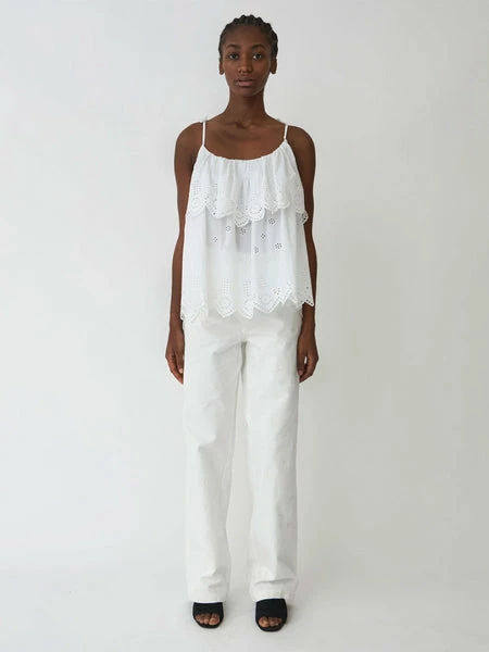 Made from a crisp cotton broderie anglais – the Alberthe Top by Stella Nova. This top is cut to a relaxed fit and designed with an open round neckline, adjustable spaghetti straps and a tiered bodice. Pair with linen shorts or trousers and sandals for a classic summer outfit. Adjustable tie spaghetti straps Round neckline Sleeveless Broderie anglaise fabric with scallop hem Tiered bodice Relaxed fit Unlined Composition: 100% Cotton. Care: Machine wash 30c. Iron on a low heat. Do not tumble dry.