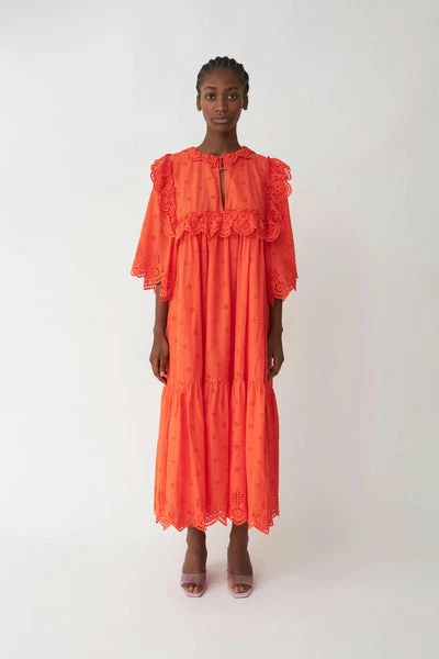 Lovely midi dress in organic cotton with ruffle, pointelle details and slit with tie strings at neckline. Comes in a Vibrant Orange Red. – True to size- Loose fit- Ruffle details- The model is wearing a size 38 Quality: 100% CottonWashing instructions: Machine wash in cold water(30 degrees)/Handwash program. Iron on low heat. Shrinkage: Approx. 4-5%. Check care label inside item for further information