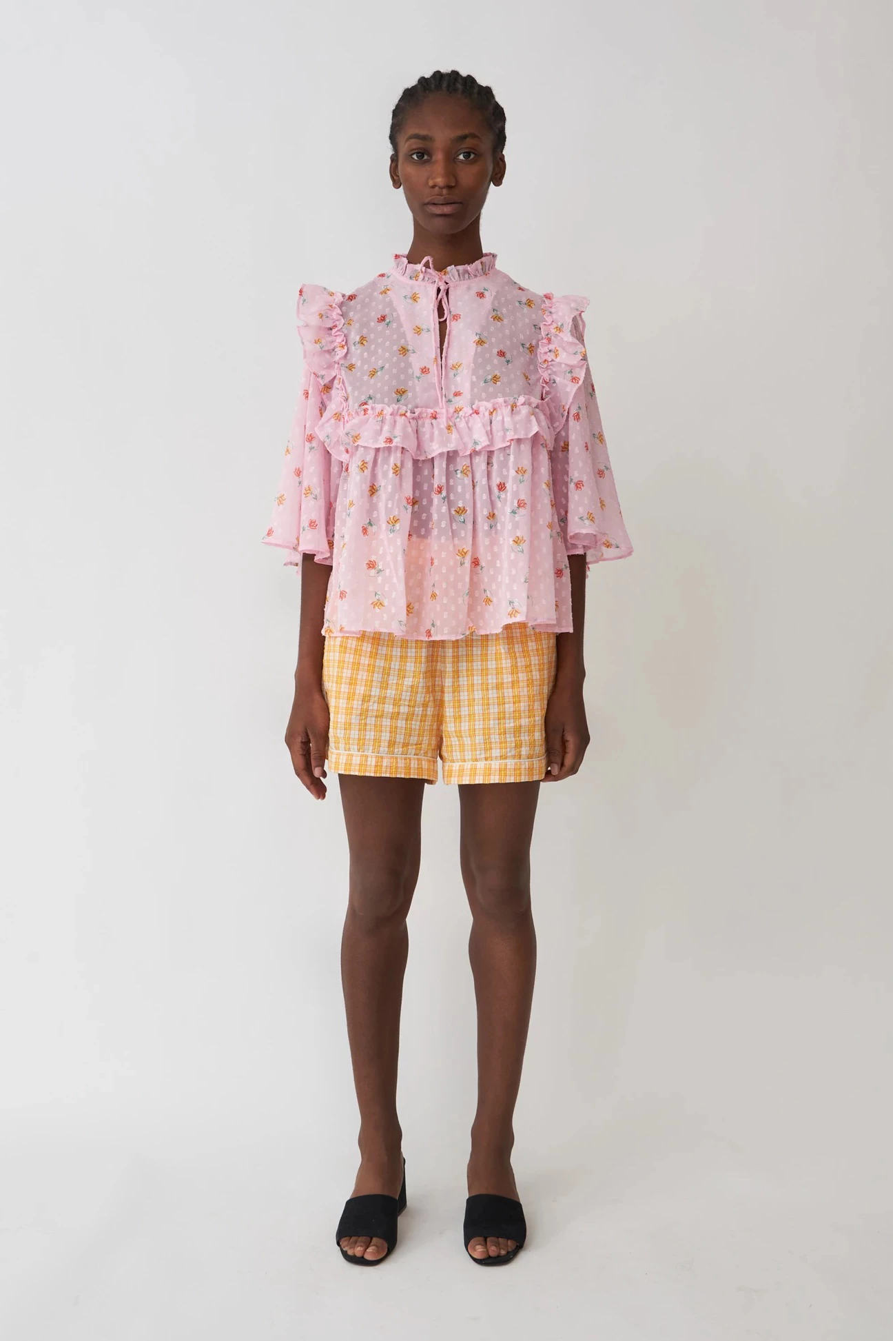 Lovely blouse with ruffle details and slit with tie strings at neckline. With 100% Polyester lining.