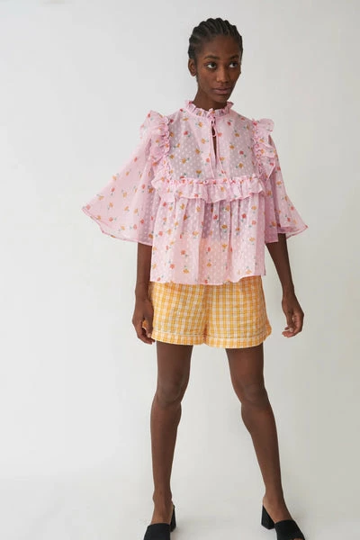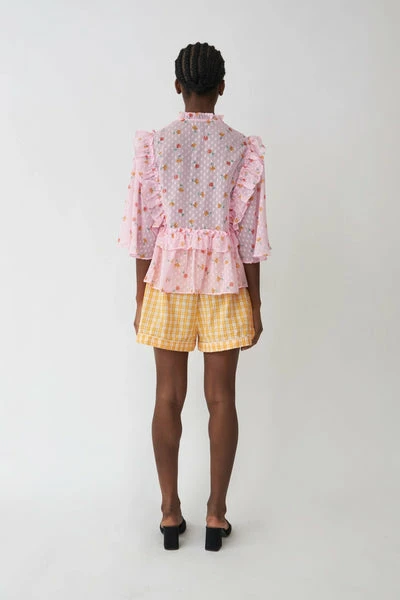 Lovely blouse with ruffle details and slit with tie strings at neckline. With 100% Polyester lining.- True to size- Loose fit- Ruffle details Quality: 100% Polyester Washing instructions: 30°C. Iron on low heat. Shrinkage: Approx. 2-3%. Check care label inside item for further information. Do not bleach Dryclean using any solvent except trichloroethylene gentle No tumble drying Iron low Wash max 30