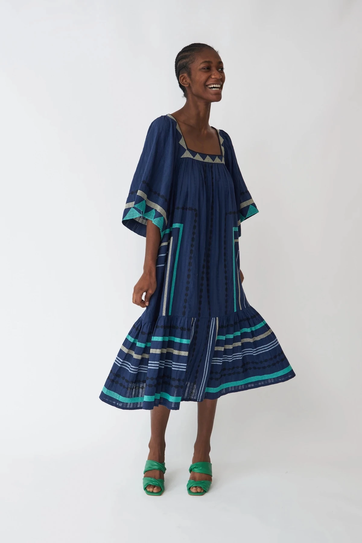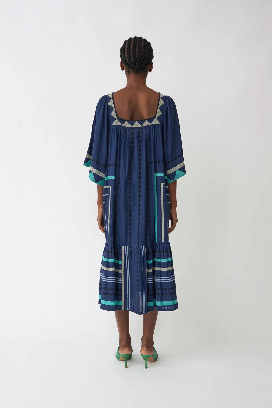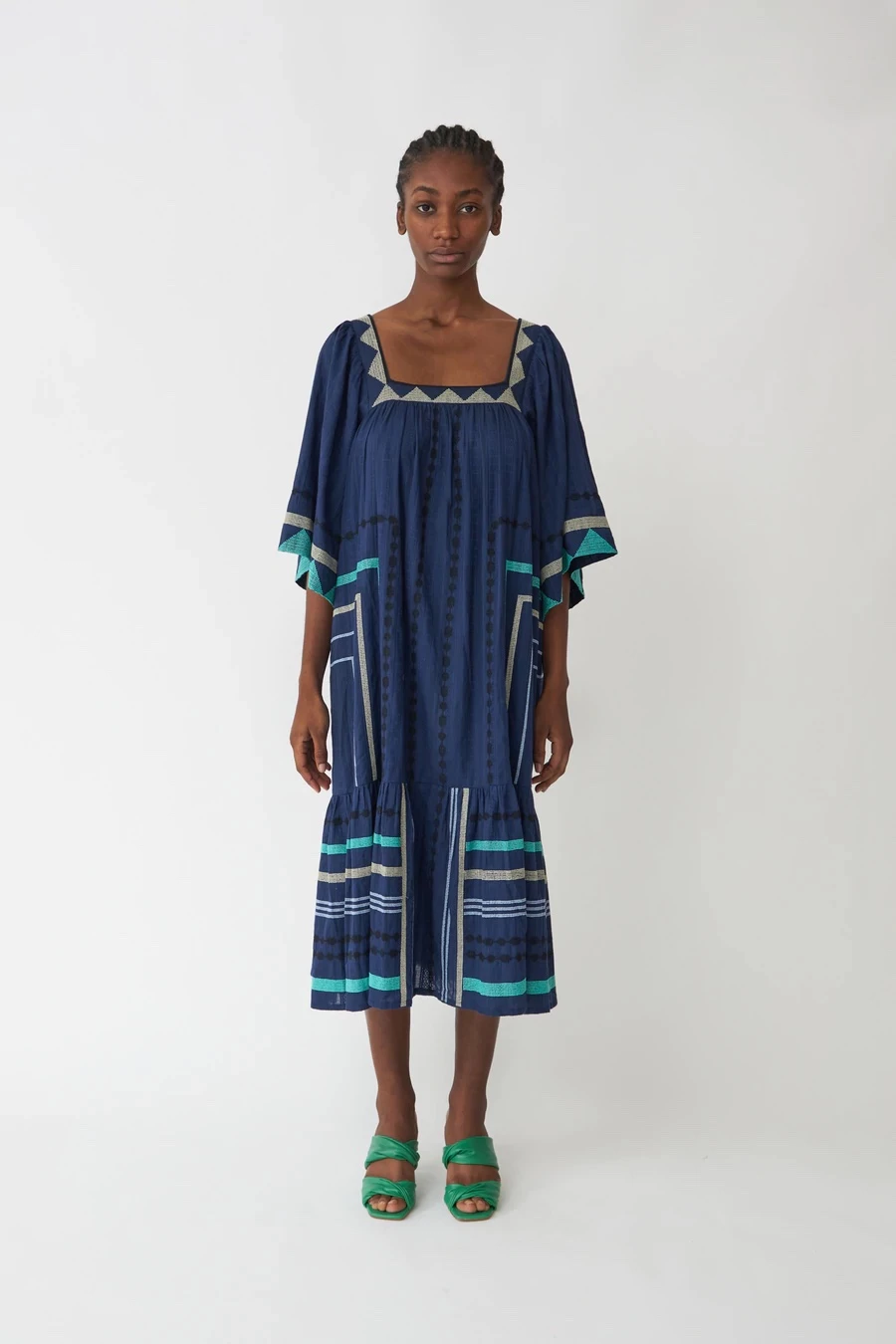 Cool dress with embroidery details, short sleeves and square neckline.