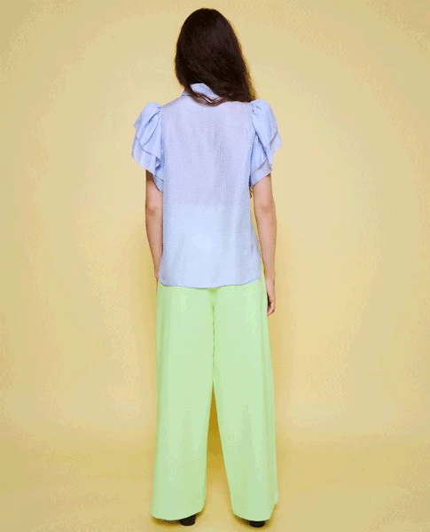 Stella Nova Caitlyn Blue Silk Blouse, a lightweight blue silk blouse with short sleeves and a printed collar. Fastening down the front with a row of blue buttons this loose and straight fitting shirt has ruffled shoulders. 100% Silk Dry Clean Model is 173cm and wears size 38 Size down if between sizes as Stella is a generously sized brand