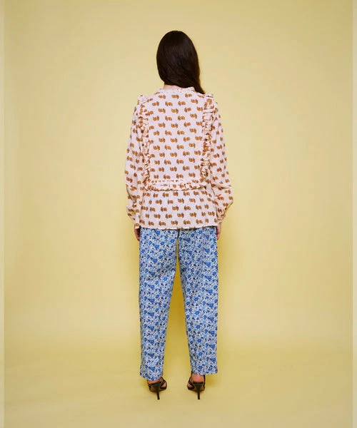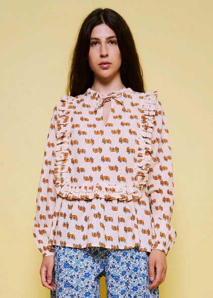 Beautiful blouse with small foxes. The blouse has long sleeves with a single button closure and frill details. – True to size – Loose fit – The look book model is 173 cm / 5’8″ and wearing a size 38 Quality: 100% Cotton Washing instructions: 30°C. Iron on low heat. Shrinkage: Approx. 3-5%. Check care label inside item for further information.