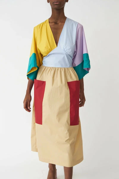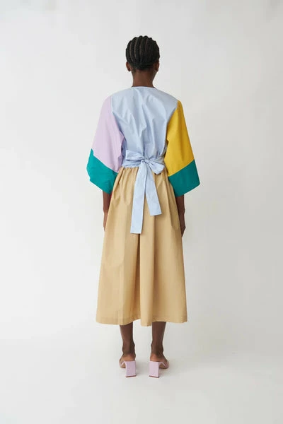 Midi dress with marked waist, a ribbon that can be tied either front or back and V-neck. The sleeves are wide and at 3/4 length. – True to size- Regular fit- The model is wearing a size 38 Quality: 100% Cotton Handwash – Iron low – No tumble drying