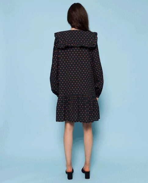 Stella Nova Charlie Floral Dress, a black mini dress with long sleeves and an oversized fit. Covered in an orange floral print this knee length Summer dress has an oversized quilted collar and buttons running down the front. 100% Cotton Machine wash cool Mode is 173cm and wears size 38 UK12 Size down if between sizes as it is a loose fitting dress