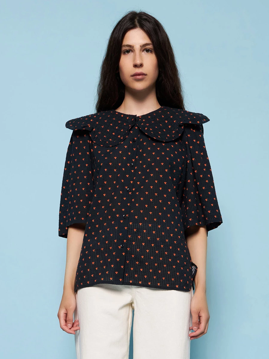 Meet dicte, a loose fit blouse with big sleeves. Oversized scalloped collar. True to size. Loose fit. Button front. Composition: 100% cotton.