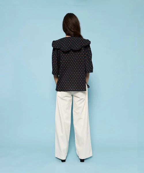 Loose fit blouse with big sleeves. The blouse has a feminine collar and buttons at the front. – True to size- Loose fit- The look book model is 173 cm / 5’8″ and wearing a size 38
