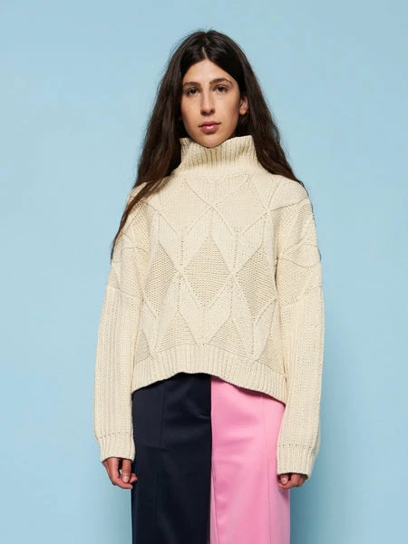 Spun from a comfortable cotton blend with a woven diamond pattern and a high neckline, this classic cream jumper from Stella Nova is primed for cuddles and a busy schedule. – Oversized fit – Ribbed trims – Funnel neck – Long loose sleeves S M L Chest pit to pit (cm) 64 69 74 Sleeve length (cm) 40 43 46 Total length (cm) 51 53 55 60% Cotton, 40% Acrylic Handwash in cold water. Do not tumble try. Iron on low heat. Shrinkage: Approx. 2-3%. Made in China LC22-3916 029