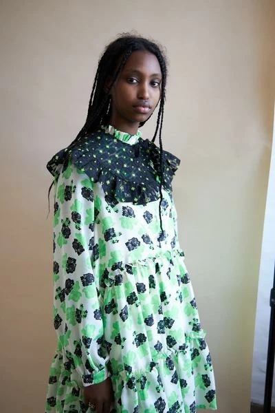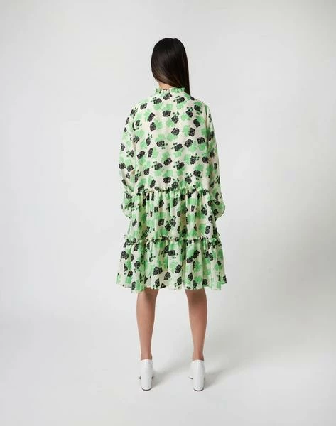 Wide, fluid dress in recycled polyester with long sleeves, ruffle details and a placket with button closure at front. It comes in off white with black and lime green flower pattern. With 100% recycled Polyester lining.- Voluminous in size. Go down a size if you prefer a more regular fit- Loose wide fit- Ruffle details – The look book model is 173 cm / 5’8″ and wearing a size 38 Quality: 100% Polyester (recycled)Washing instructions: 30°C. Iron on low heat. Shrinkage: Approx. 2-3%. Check care label inside item for further information.