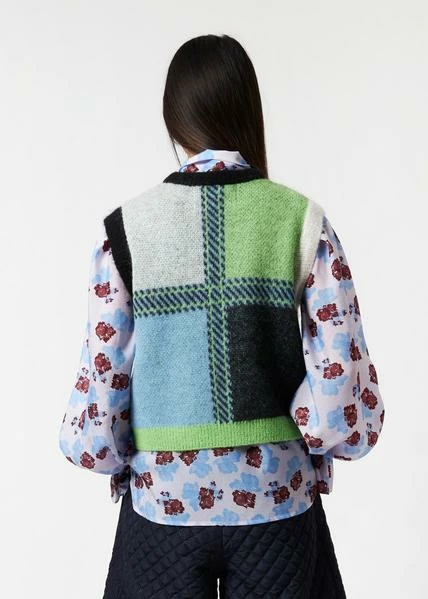 STELLA NOVA Hallie May Vest – Fresh Mix Cool colour block vest in an Alpaca mix with a high collar. – True to size – Regular fit – The model is 173 cm / 5’8″ and wearing a size 38 Quality: 55% Baby Alpaca, 45% Nylon Washing instructions: Handwash in cold water. Iron on low heat. Shrinkage: Approx. 2-3%. Check care label inside item for further information. Style ref: BA21-3885