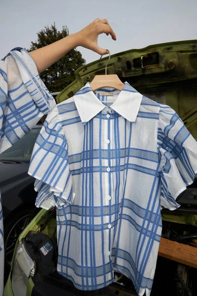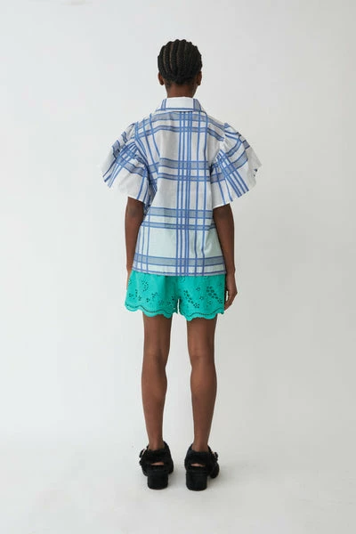 Stella Nova Harper Blouse – White/Blue Beautiful top with collar, short ruffle sleeves and buttons at the front. – True to size – The model is wearing a size 38 Quality: 85% Cotton 15% polyester Washing instructions: 30°C. Iron on low heat. Shrinkage: Approx. 3-5%.