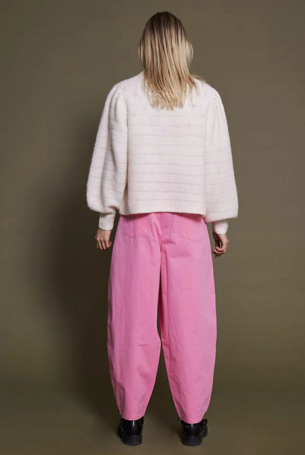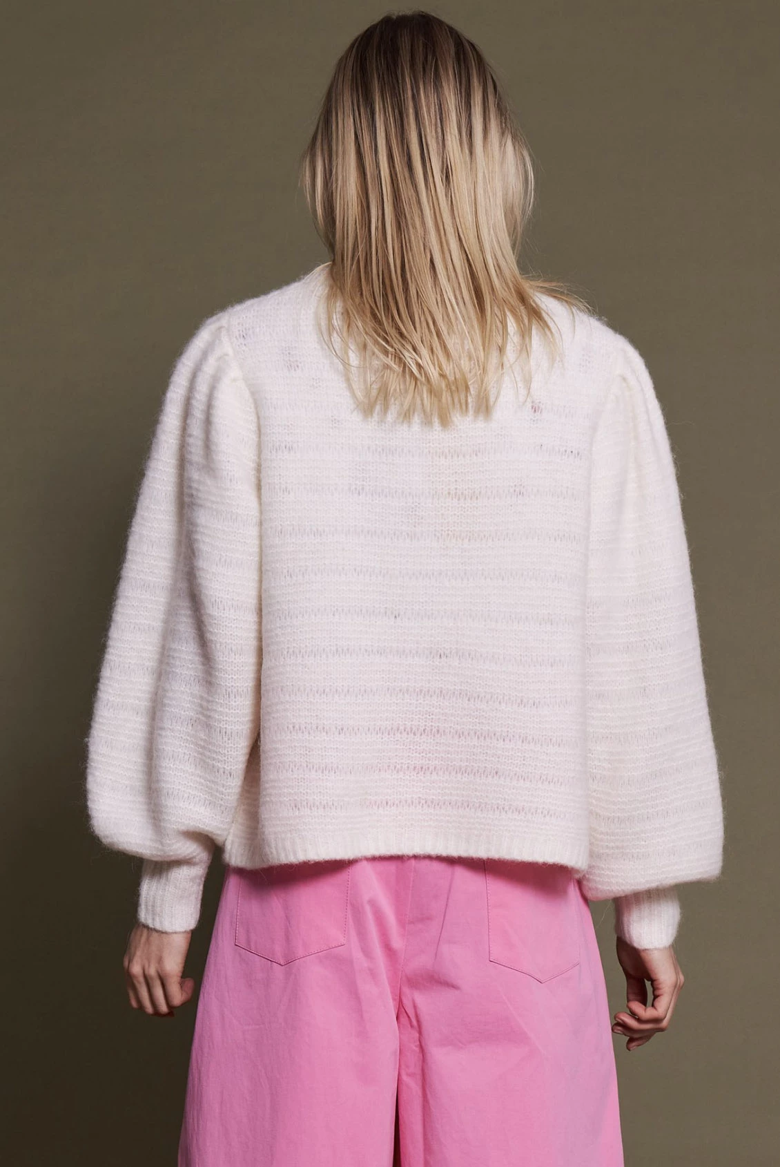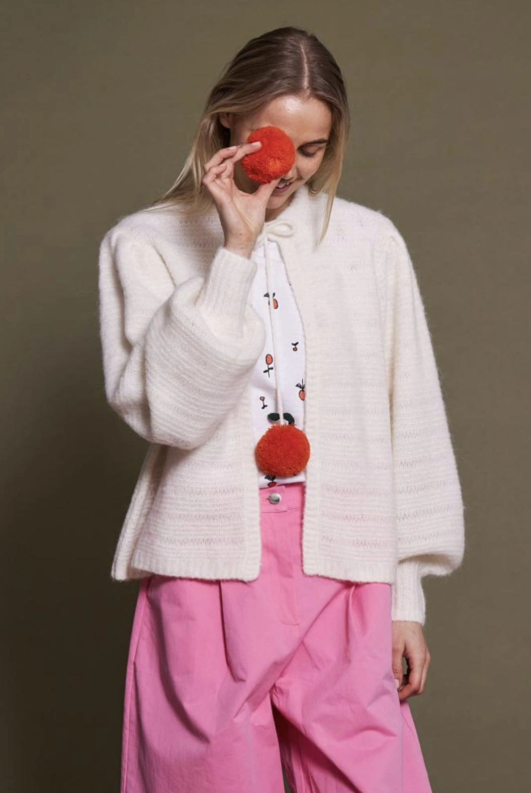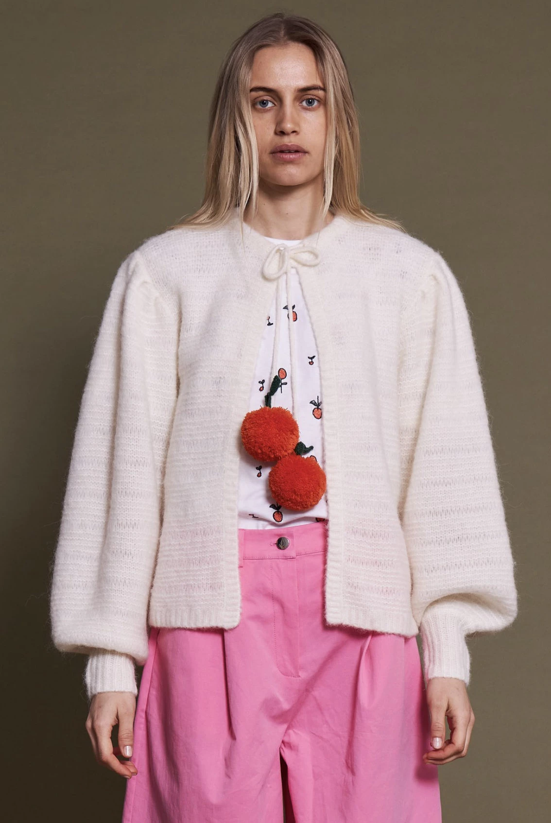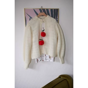Lovely open cardigan in a wool mix with drawstring closure with cherry pompoms and balloon sleeves.