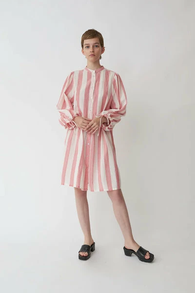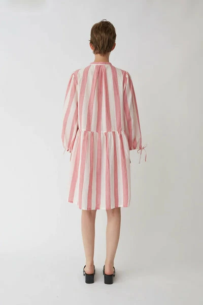 Lightweight mini dress with long wide sleeves with ribbons at the end so you can adjust to go for a balloon shape or keep the wide. The dress is oversized with a ruffled seam at the waist. – True to size- Loose fit- The model is wearing a size 38 Quality: 100% Cotton Handwash – Iron low – No tumble drying