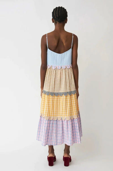The Lillibeth Dress by Stella Nova cuts a voluminous shape, with its tiered design in contrasting check patterns and scalloped edges. This pretty frock shows off a square neckline with spaghetti straps and an A-line silhouette. Pair with sandals and your favourite sunnies for a understated look. Square neckline Adjustable spaghetti straps A-line silhouette Tiered design with scallop trim Contrasting check patterns Mid ankle length Composition: 100% Cotton. Care: Hand wash. Iron on a low heat. Do not tumble dry.