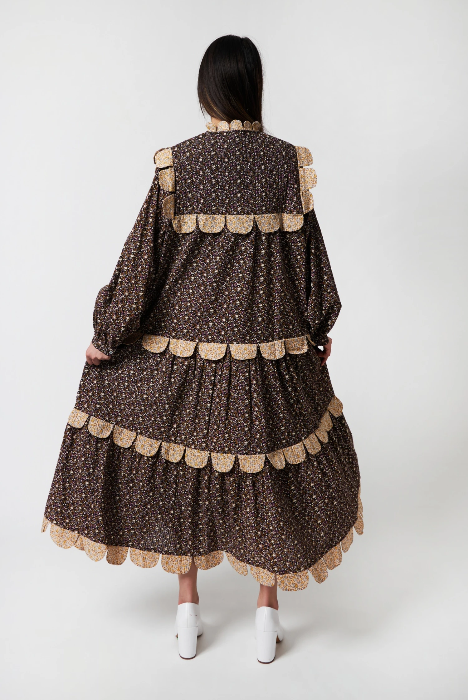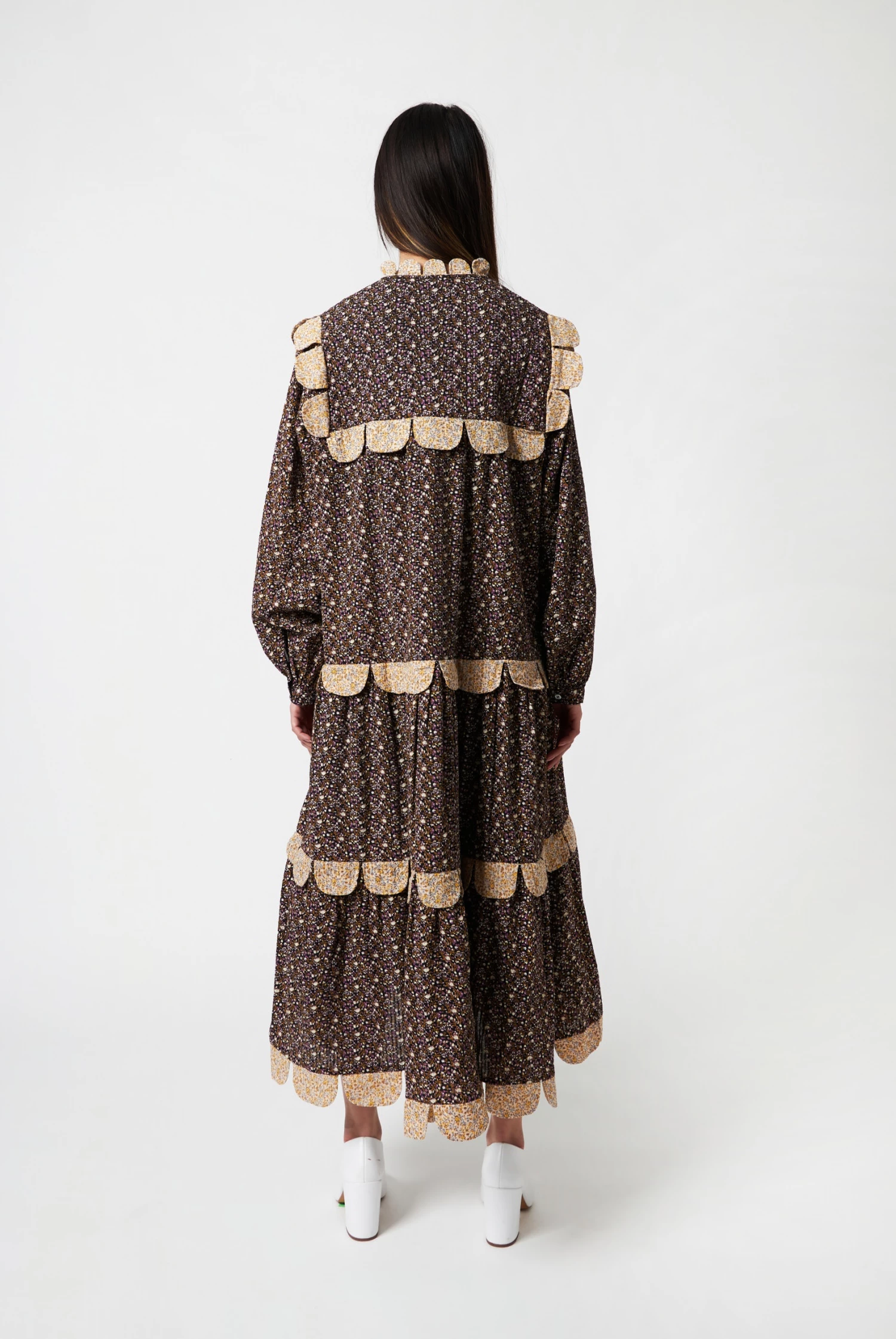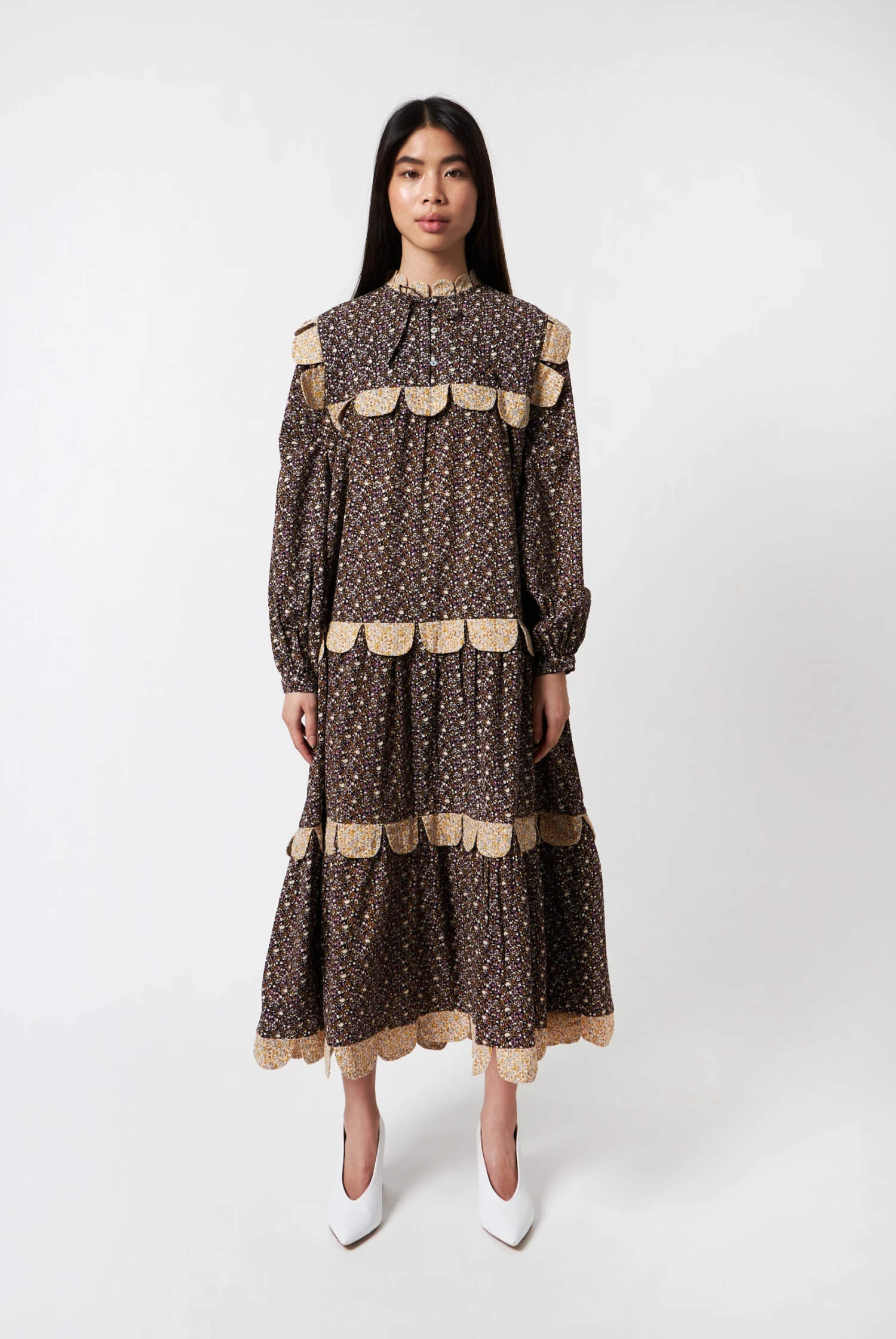 The Stella Nova iconic Loan dress in Flower Bud Dark/Purple with long sleeves, a single button closure and button closure at the front.