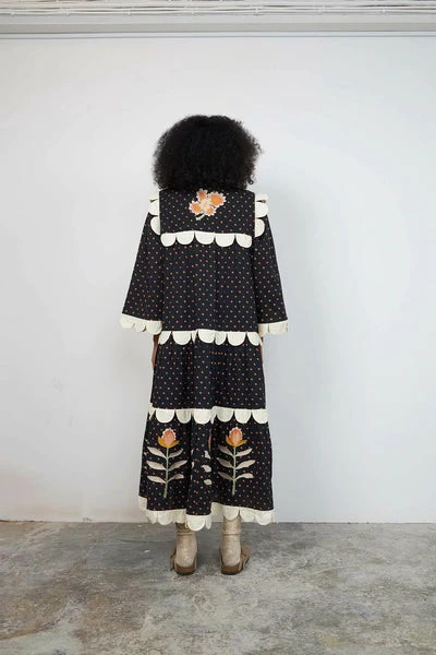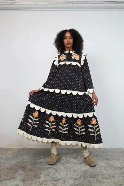 The iconic Loan dress with small flowers and embroidery details. The dress has long sleeves and button closure at front. Comes in black with cream and orange details.- Voluminous in size. Go down a size if you prefer a more regular fit- Loose wide fit- The look book model is 173 cm / 5’8″ and wearing a size 38 Quality: 100% CottonWashing instructions: Handwas/Machine wash in cold water/Handwash program. No tumble drying. Iron on low heat. Do not bleach. Shrinkage: Approx. 3-4%. Check care label inside item for further information.