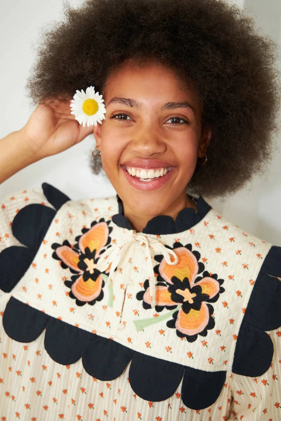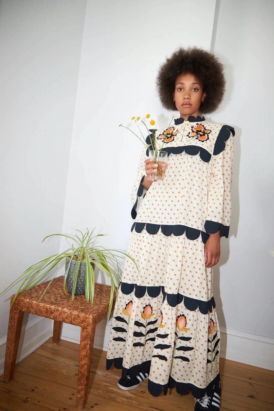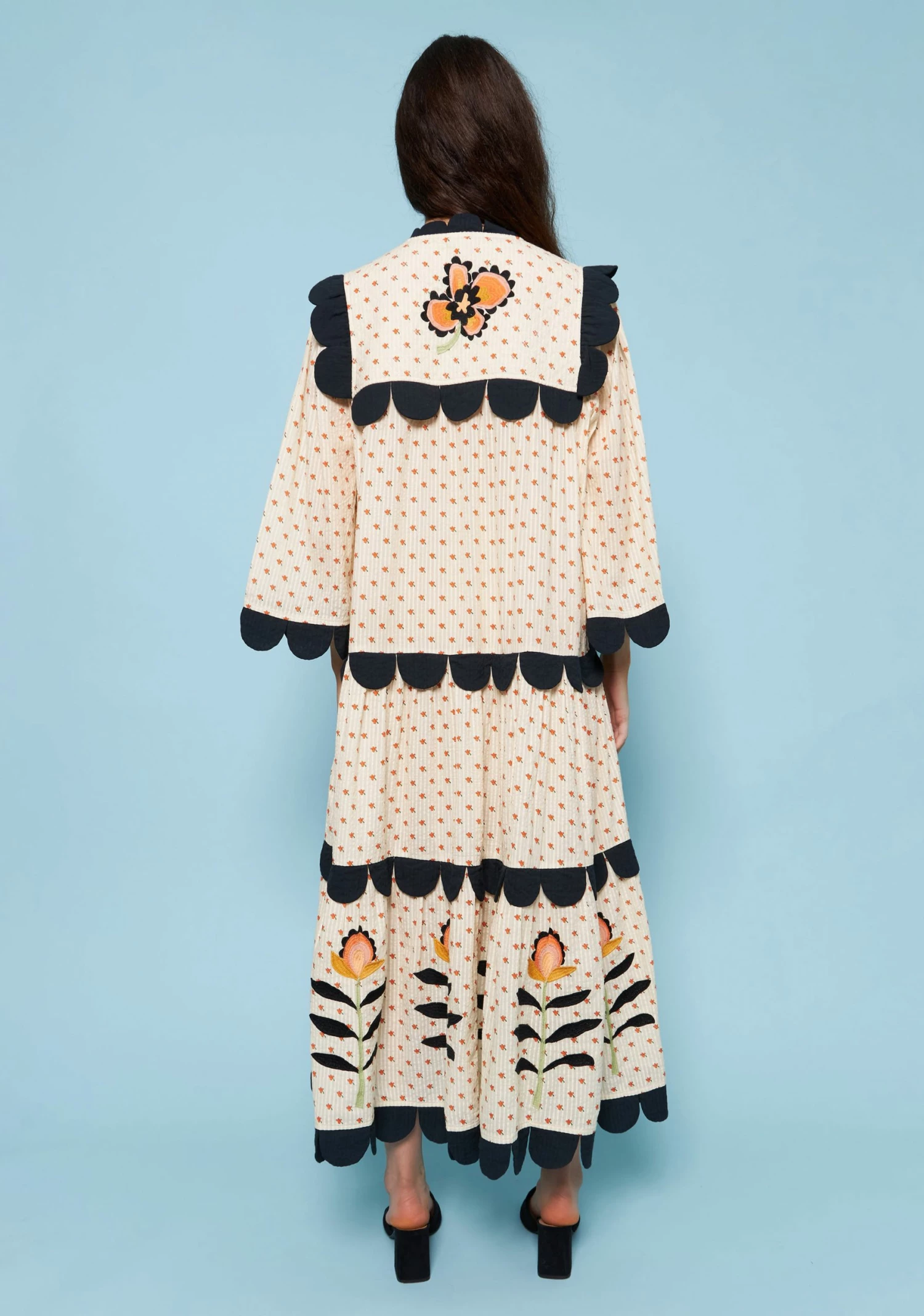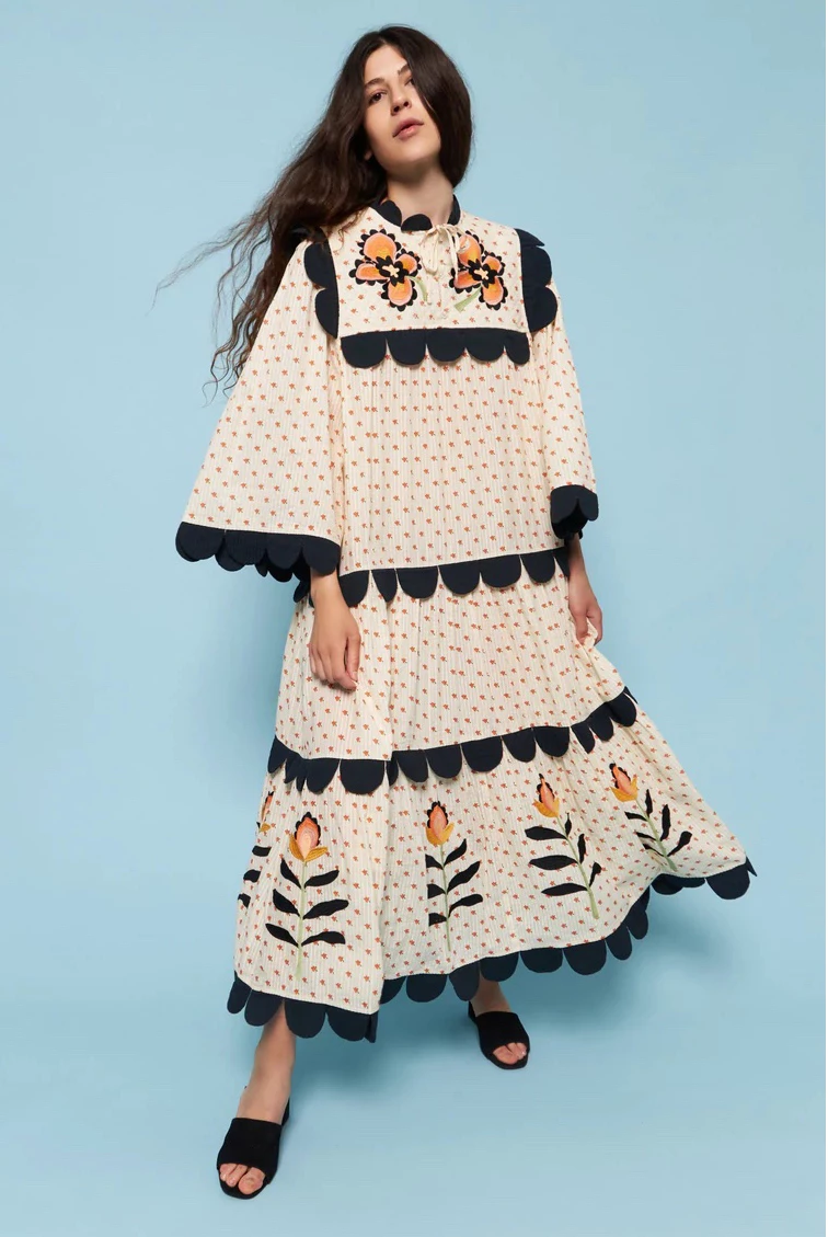 The Stella Nova iconic Loan dress with small flowers and embroidery details. The dress has long sleeves and button closure at front.