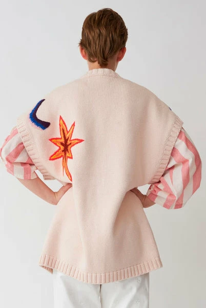 Stella Nova Maily Sleeveless Knitted Vest – Soft Pink Make a statement with this cool oversized knitted v-neck vest cardigan, boxy style with four buttons down the front. Features colourful embroidered moon and stars motifs to the front and back. Loose oversized fit. 60% Cotton, 30% Nylon, 10% Wool Hand wash