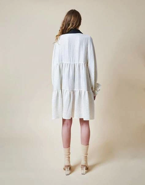 Feminine dress in white with a contrasting black collar. It has long sleeves, a few hidden buttons leading up to the collar with a tie string around the neck. Tie it as a bow tie or remove completely – yours to play around with it! We also have this style in a blouse; The Neo Blouse from Stella Nova. – True to size- Loose fit- The look book model is 173 cm / 5’8″ and wearing a size 38 Quality: 58% Rayon, 42% NylonWashing instructions: 30°C. Iron on low heat. Shrinkage: Approx. 2-3%. Check care label inside item for further information.