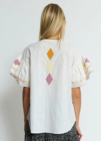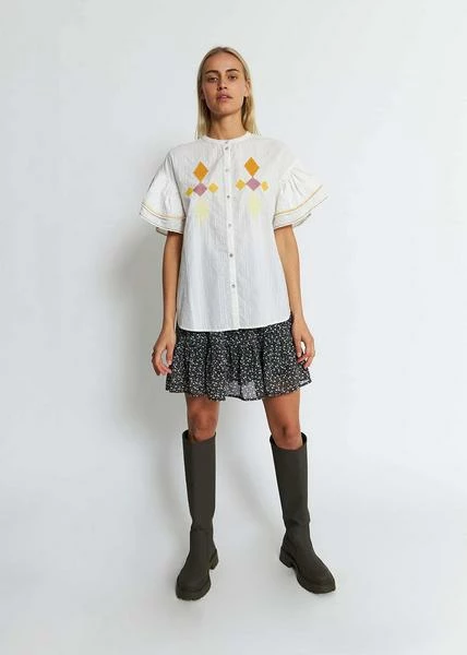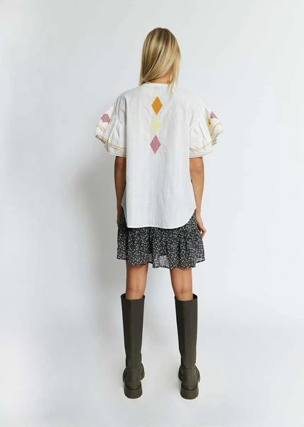 STELLA NOVA Nafas Top – Ivory Folklore inspired top with ebroideries. The top has a round neck, placket with button closure at front and short ruffle sleeves. True to size Loose fit Ruffle detail The look book model is 173 cm / 5’8″ and wearing a size 38 Quality: 100% Cotton Style ref: #CF13-17017834