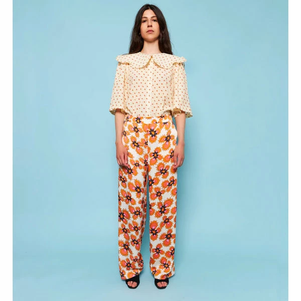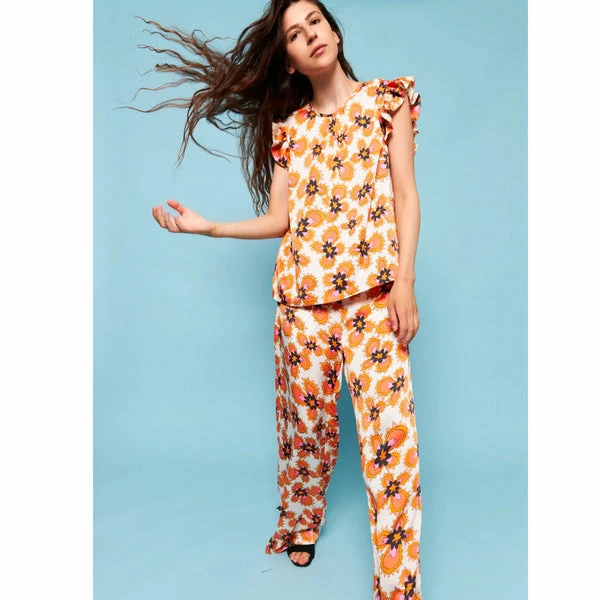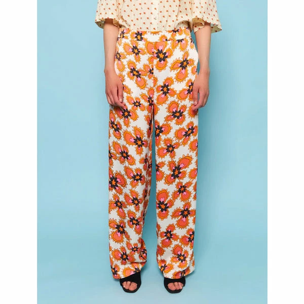 We love the colour combination in the print of these Stella Nova Orli pants. The orange, pink and black really sing out against the cream background, printed on 100% recycled polyester. These trousers have a wide leg with pockets and elastic on the reverse of the waistband. Team with the matching Stella Nova Bolette Top for a great summer look or with the Stella Nova Floral Dicte Top tucked in. Quality: 100% Polyester (recycled) Washing instructions: 30°C. Iron on low heat. Shrinkage: Approx. 3-5%. Check care label inside item for further information. Fit: True to size – The look book model is 173 cm / 5’8″ and wearing a size 38