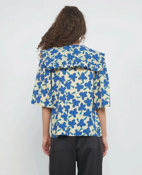 oose fit blouse with big sleeves. The blouse has a feminine collar and buttons at the front in a bright blue tone.- True to size- Loose fit- The model is wearing a size 38 100% Cotton